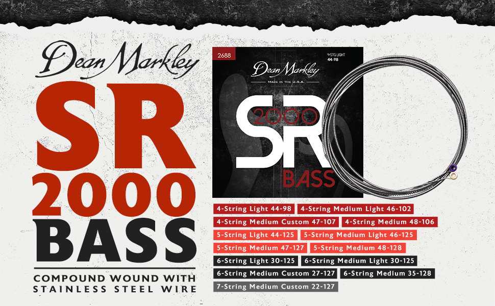 Komplet 4 strun do gitary basowej z serii SR 2000 Bass. Grubości: .044 .060 .078 .098. Komplet 4 strun do gitary basowej z serii SR 2000 Bass. Grubości: .044 .060 .078 .098. Seria SR 2000 to struny basowe o mięsistym, głębokim tonie. Brzmią rewelacyjnie, bardzo wysoka trwałość. Owijka wykonana jest ze stali nierdzewnej. Wszystkie struny firmy Dean Markley przechodzą przez rygorystyczną kontrolę jakości i dzięki temu otrzymujemy doskonały produkt.