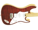 Gitara elektryczna 6-strunowa Aria Pro II 714-MK2 - Fullerton. Korpus: topola. Top: klon wzorzysty. Gryf: klon „opiekany” - Roasted Maple. Podstrunnica: klon „opiekany” - Roasted Maple. Typ łączenia z korpusem: wkręcany – Bolt-on. Ilość progów: 22. Skala instrumentu: 648 mm. Przetworniki w układzie: HSS OS-5 Single coil x 2, CPH-1 Humbucking x 1.Potencjometry: volume, Tone, 5-way PU Selector SW, Coiltap SW x 1(Push/Pull Coil-tap on Tone Knob). 5- pozycyjny przełącznik przetworników. Mostek ruchomy: Wilkinson. Osprzęt chromowany. Płytka maskująca: biała perłowa - Perloid Pickguard. Kolor: czerwony: RBRD (Ruby Red).