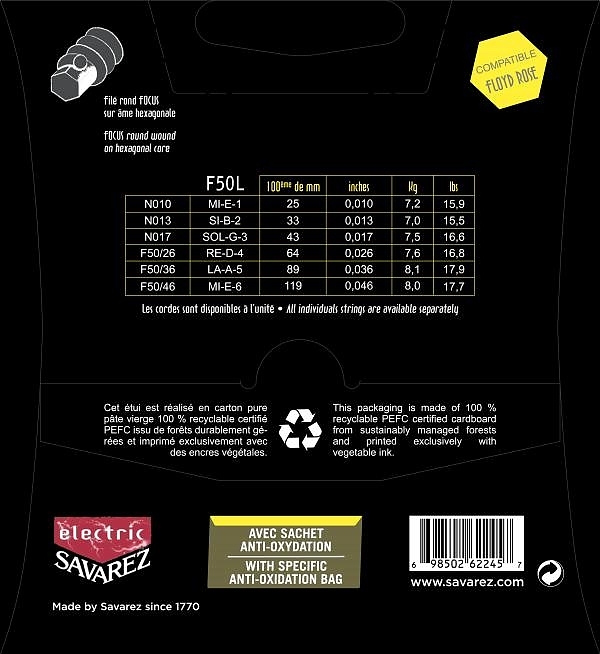 Struny do gitary elektrycznej sześciotrunowej z serii Focus. Struny basowe/okrągła owijka ze stali nierdzewnej na sześciokątnym rdzeniu. Rozmiary: 010. 013. 017. 026. 036. 046. Nowa, innowacyjna formuła Savarez zapewnia przedłużoną żywotność strun oraz stabliny strój nawet podczas intensywnego używania mostków typu Floyd Rose.