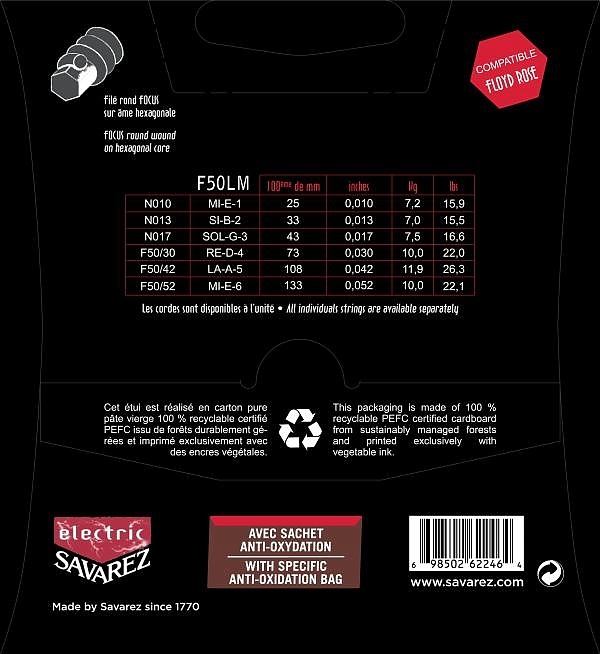 Struny do gitary elektrycznej sześciotrunowej z serii Focus. Struny basowe/okrągła owijka ze stali nierdzewnej na sześciokątnym rdzeniu. Rozmiary: 010. 013. 017. 030. 042. 052. Nowa, innowacyjna formuła Savarez zapewnia przedłużoną żywotność strun oraz stabliny strój nawet podczas intensywnego używania mostków typu Floyd Rose.