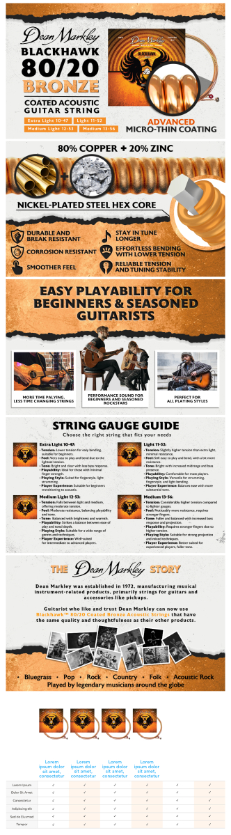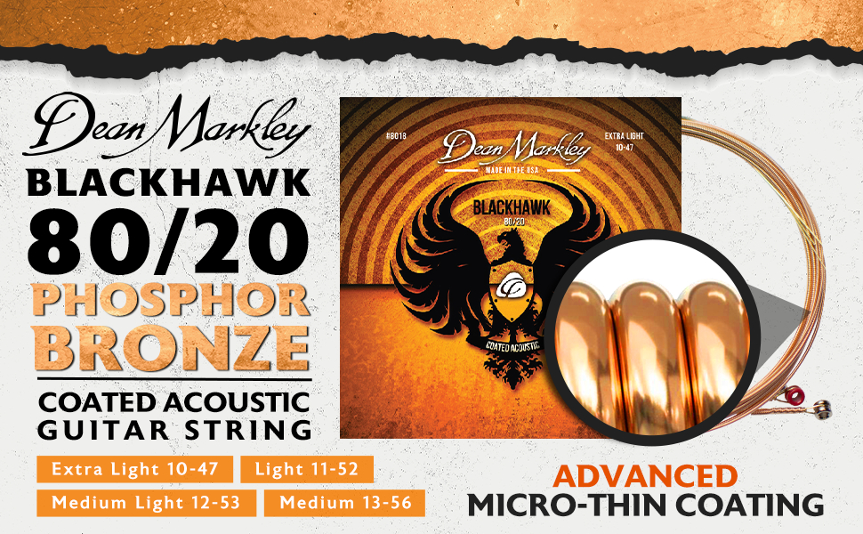 Komplet 6 strun do gitary elektrycznej z serii BLACKHAWK Coated Acoustic - Phosphor Bronze. Struny do gitary akustycznej Blackhawk Coated to najnowsza pozycja w ofercie Dean Markley. W ich konstrukcji wykorzystano niklowany rdzeń z wysoko węglowej stali oraz innowacyjną mikro powłokę, która zapewnia stabilność stroju i zwiększa żywotność strun aż czterokrotnie. Blackhawk są również bardziej odporne na zrywanie niż standardowe struny. Rozmiar: 13-56. Medium.