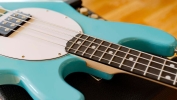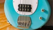 Gitara basowa Sterling RAY2 (ELB-A1). Gitara w kolorze niebieskim (Electric Blue). Korpus: Topola. Mostek: Fixed Bridge. Pickguard: biały. Skala: 34" (86.4cm) Radius: 9.5" (24cm). Progi: 21, Medium. Szerokość na siodełku: 1.57" (40mm). Szerokość na ostatnim progu: 2.44" (62mm). Gryf: klonowy. Podstrunnica: Amaranth. Maszynki: Open Gear. Pręt do regulacji gryfu: tak. Potencjometry: 1 Volume, 1 Tone. Przystawki: H - 1 Ceramic Humbucker. Ilość strun: 4. Struny: .045-.105