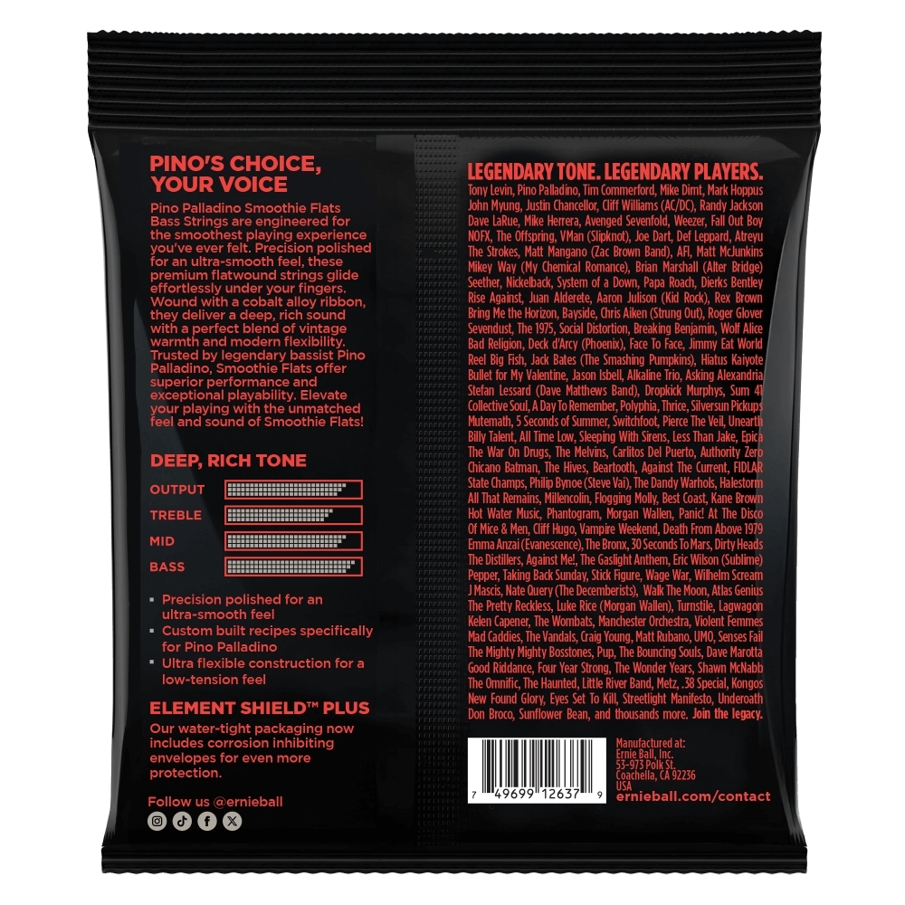 Struny basowe Pino Palladino Signature Smoothie Flats zostały zaprojektowane z myślą o płynnej i łatwej grze. Precyzyjnie szlifowane dla uzyskania ultra-gładkiego brzmienia, te wysokiej jakości struny z płaską owijką z łatwością przesuwają się pod palcami. Owijka ze stopu kobaltu, oferują głębokie, bogate brzmienie, które idealnie łączy w sobie ciepło vintage z nowoczesną elastycznością. Opracowane we współpracy z legendarnym basistą Pino Palladino, struny Smoothie Flats oferują doskonałą wydajność i wyjątkową grywalność. Rozmiary: 38-54-68-98