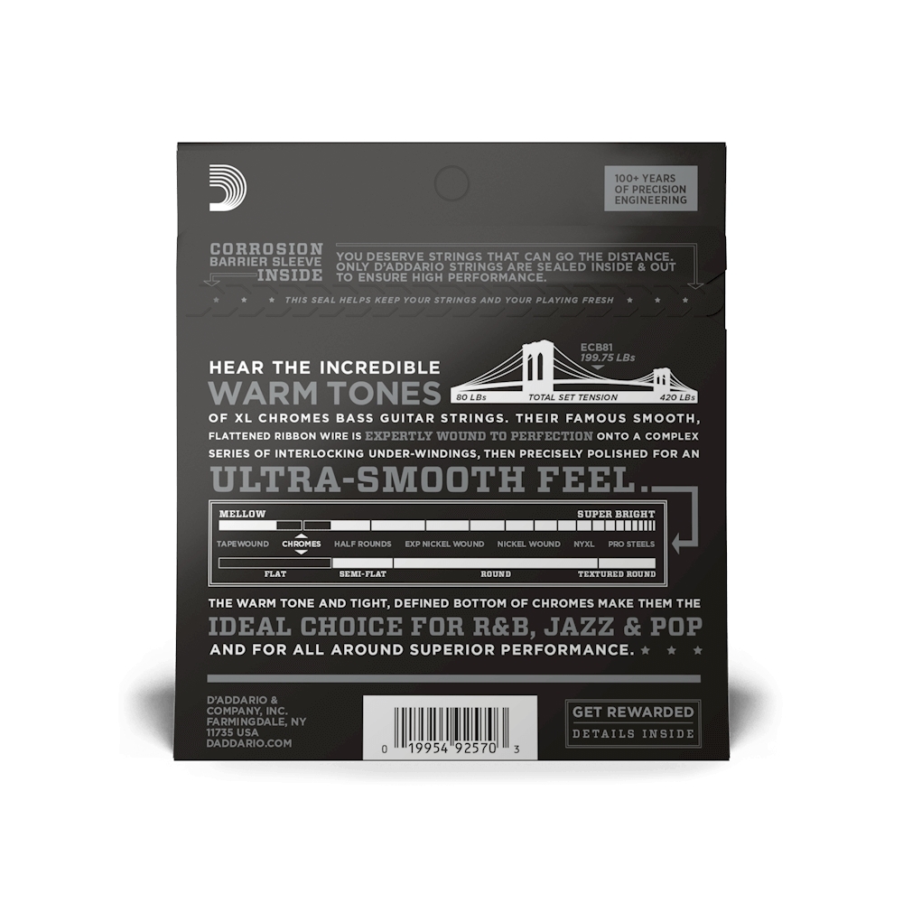 D’Addario ECB81 Chromes Bass to profesjonalne struny typu flatwound w rozmiarze Light 45-100, dedykowane basom o menzurze Long Scale. Dzięki polerowanej owijki ze stali nierdzewnej struny są niezwykle gładkie, redukują hałasy przesuwania palców i zapewniają wyjątkowy komfort gry — idealny dla basistów ceniących eleganckie, stonowane brzmienie. Chromes słyną z ciepłego, głębokiego tonu z wyraźnym środkiem i naturalnym sustainem, co sprawia, że świetnie pasują do jazzu, R&B, muzyki soul, popu oraz klasycznych stylów vintage. Wysoka trwałość i precyzyjna intonacja są efektem amerykańskiej produkcji D’Addario.