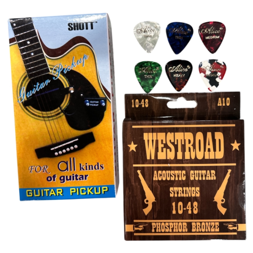 Promocyjny zestaw przydatnych akcesoriów do gitary akustycznej w rewelacyjnej cenie, zawiera pickup montowany w otworze rezonansowym umożliwiający podłączenie gitary do wzmacniacza lub miksera, komplet strun phosphor bronze o rozmiarze 10-48 oraz zestaw 6-ciu piórek.